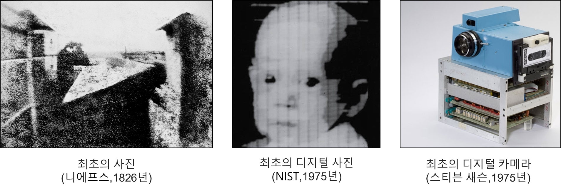 최초의 2D 영상은 1826년 니에프스(Joseph Nicephore Niepce)가 8시간에 걸쳐 찍은 아날로그 사진입니다. 그는 이 사진을 태양광선으로 그리는 그림이라는 뜻의 헬리오그래피(heliography)라고 불렀습니다. 하지만 노출 시간이 너무 길기 쉽게 상업화되지는 않았습니다. 최초의 디지털 카메라는 1957년 미국국립표준기술연구소(NIST)에서 디지털 스캐너로 입력한 이미지입니다. 이후 1975년 코닥 직원인 스티븐 새슨이 최초의 디지털 카메라를 개발하였습니다. CCD이미지 센서를 사용해 1메가 픽셀(100 x 100) 해상도의 흑백 사진을 촬영할 수 있습니다. 오늘날에는 휴대폰에서 1,200만 픽셀의 이미지 촬영이 가능합니다. [그림 1.2]는 최초의 2D 영상 데이터와 장비입니다.