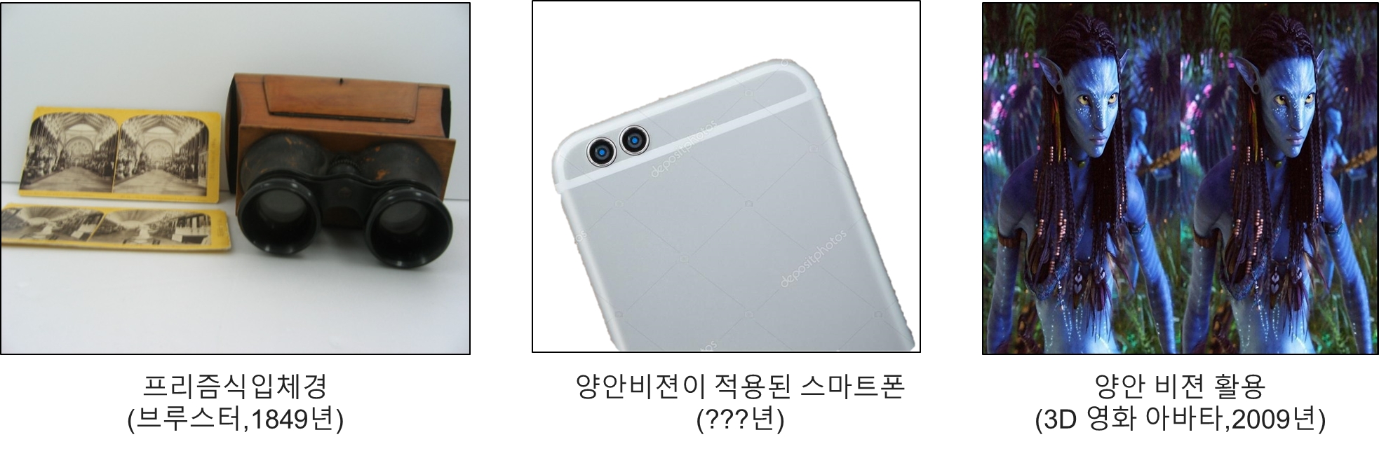 3D 영상은 센서에 따라 크게 수동 방식과 능동 방식으로 수집할 수 있습니다. 수동 방식은 사람의 눈과 같이 두대의 카메라를 이용해 수집하는 방식으로 1838년 찰스 휘트스톤(Charles Wheatstone)의 양안 시차 발견과 함께 시작됐습니다. 이후 1849년 다비드 브루스터(David Brewster)가 프리즘식 입체경을 고안하면서 널리 활성화됐습니다. 최근 영화관에서 상영되는 3D 영상들도 이런 양안 시차를 기반으로 한 것입니다. [그림 1.3]은 수동 방식의 3D 영상 데이터 수집장비와 데이터입니다.
