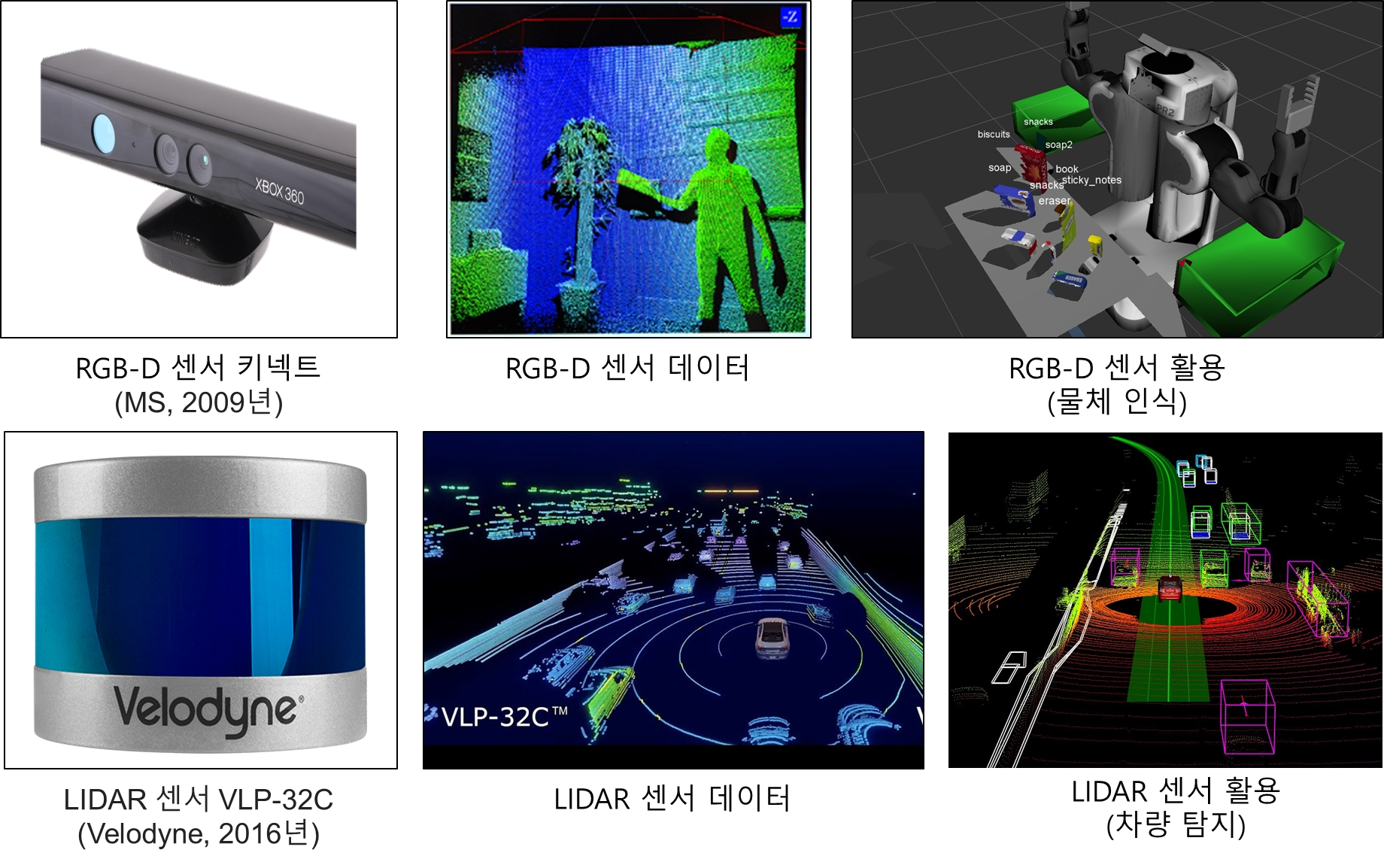 능동방식은 적외선이나 초음파, 빛 등을 이용해 거리를 측정하는 방식입니다. MS가 2009년에 공개한 키넥트 센서는 대표적인 적외선 기반 3D센서입니다. 키넥트는 카메라 센서로 이미지(RGB)정보를 획득하고, IR센서로 깊이(Depth) 정보를 동시에 수집할 수 있어 RGB-D센서라도 부릅니다. 다른 센서인 라이다(Light Detection and Ranging, LIDAR)는 빛을 이용해 3D위치 정보(x,y,z)를 수집합니다. RGB-D센서 대비 카메라가 없어 색상 정보 획득은 어렵지만 긴 측정 범위와 야외 환경에서도 안전적인 데이터 수집이 가능해 자율주행차량에서 많이 사용되고 있습니다. [그림 1.4]는 능동 방식의 3D 영상 데이터 수집장비와 데이터입니다.