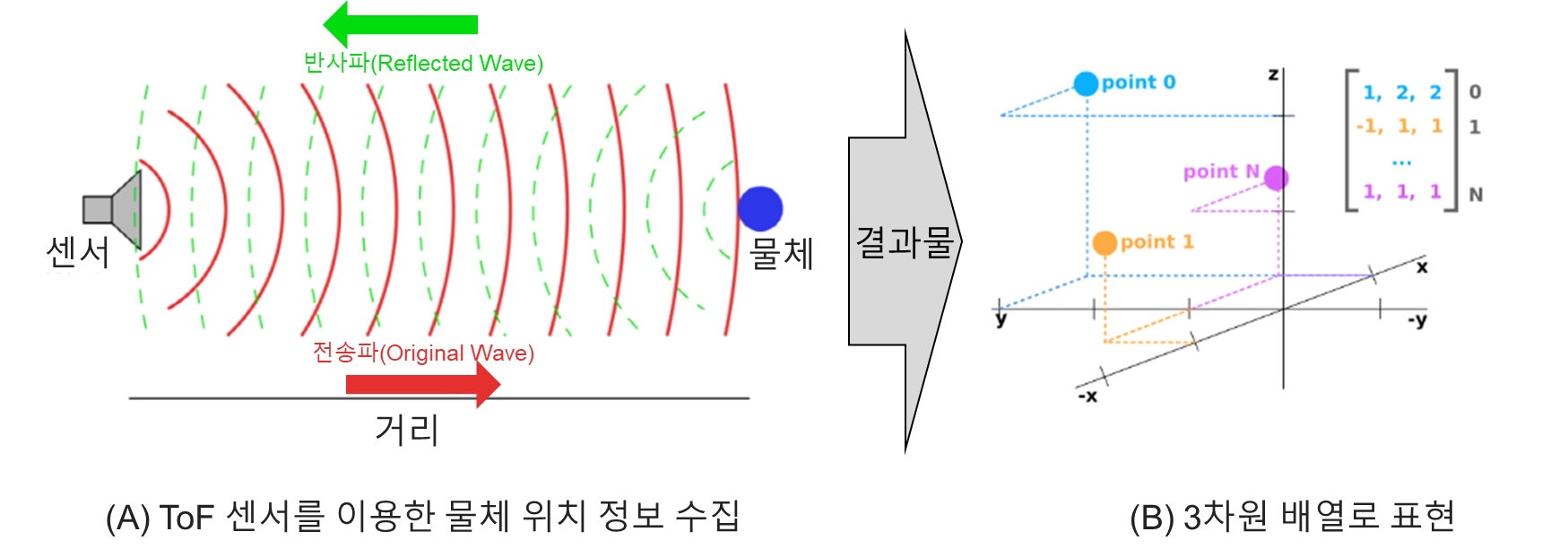 점군은 2D 이미지와 다르게 깊이(z)정보를 가지고 있어 기본적으로 3차원 배열로 표현됩니다. 여기서 각 N 줄은 하나의 점의 위치(x,y,z) 정보를 가지고 있습니다. [그림 1.6]는 능동 방식의 3D 이미지 데이터 생성 원리와 결과물을 표현한 것입니다.