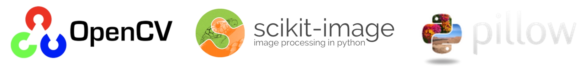 2D 영상 처리를 위한 라이브러리로는 OpenCV(OpenCV, n.d.), scikit-image(Scikit-Image, n.d.), Pillow(PIL)(Pillow, n.d.) 등이 있습니다. 대표적으로 OpenCV가 많이 사용되며 2,000년부터 인텔에서 개발해 배포하고 있습니다. 오랜 기간동안 유지된 만큼 안전성이 크고 다양한 기능을 제공하고 있습니다. [그림 1.7]은 대표적인 2D 영상처리 라이브러리의 로고들입니다.