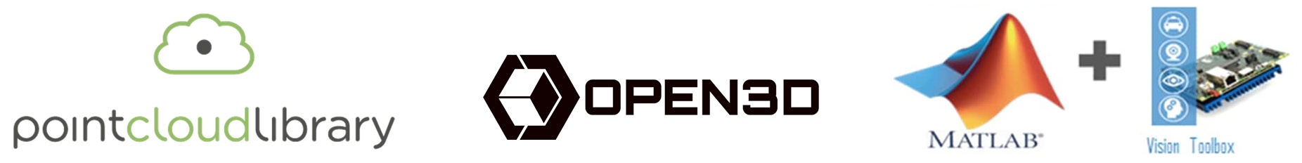 3D 영상 처리를 위한 라이브러리로는 PCL(Point Cloud Library, n.d.), Open3D(Open3D, n.d.), Matlab(Computer Vision Toolbox)(MathWorks, n.d.) 등이 있습니다. 대표적으로 PCL이 많이 사용되며 2011년 부터 라두(R.B. Rusu)이 개발해 배포하고 있습니다(Rusu & Cousins, 2011). 다양한 기능들을 제공하고 있지만 최근에는 업데이트가 잘 이뤄지지 않고 있습니다. Open3D는 2018년 인텔의 이주천(Qian-Yi Zhou)와 박재신(Jaesik Park)이 개발해 배포하고 있으며 최근 트렌드와 빠른 업데이트로 관심을 받고 있는 라이브러리 입니다(Zhou et al., 2018). [그림 1.9]는 대표적인 3D 영상처리 라이브러리의 로고들입니다.