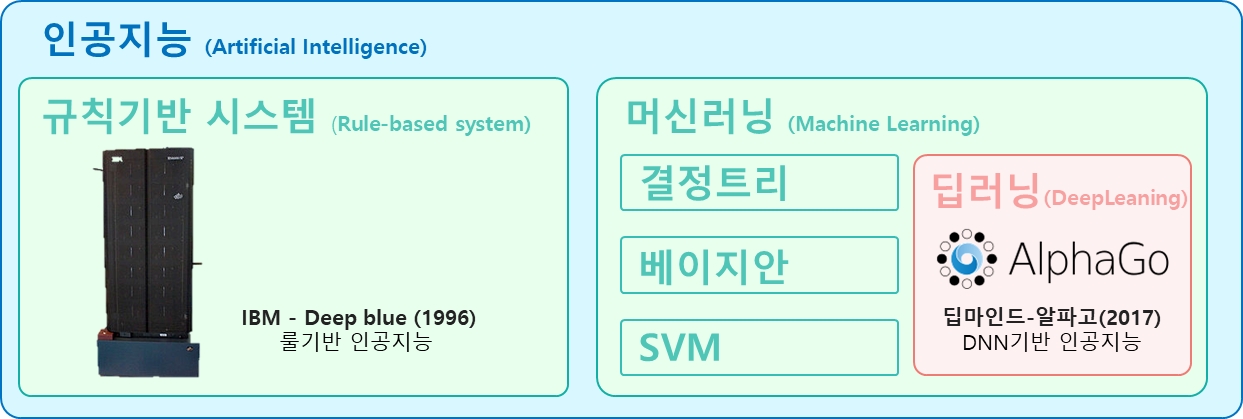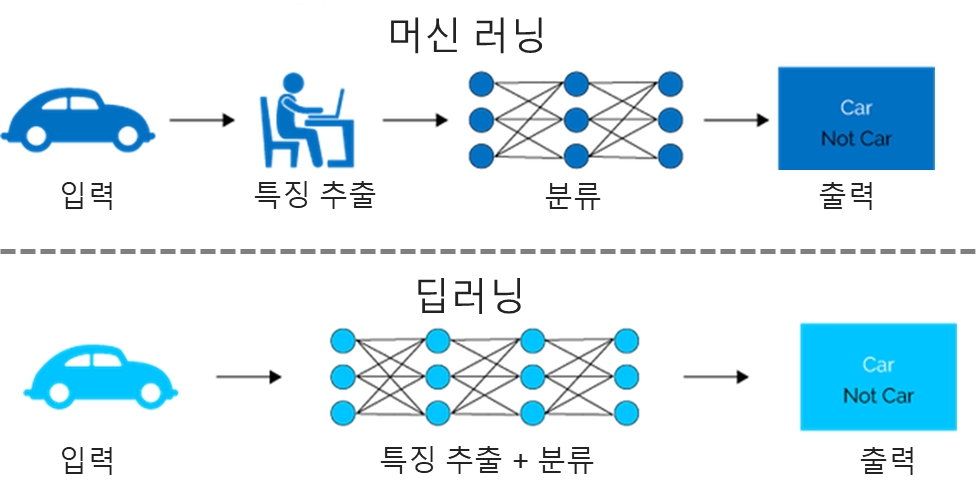 앞서 인공지능을 설명하면서 머신러닝과 딥러닝을 혼용해 설명하였습니다. 하지만 이들은 [그림 1.11]처럼 미세한 차이가 있으며 본문에서는 머신러닝과 딥러닝 기술을 별개의 기술로 분류하여 활용하고 있습니다. 따라서 둘의 개념적 차이부터 살펴보겠습니다.