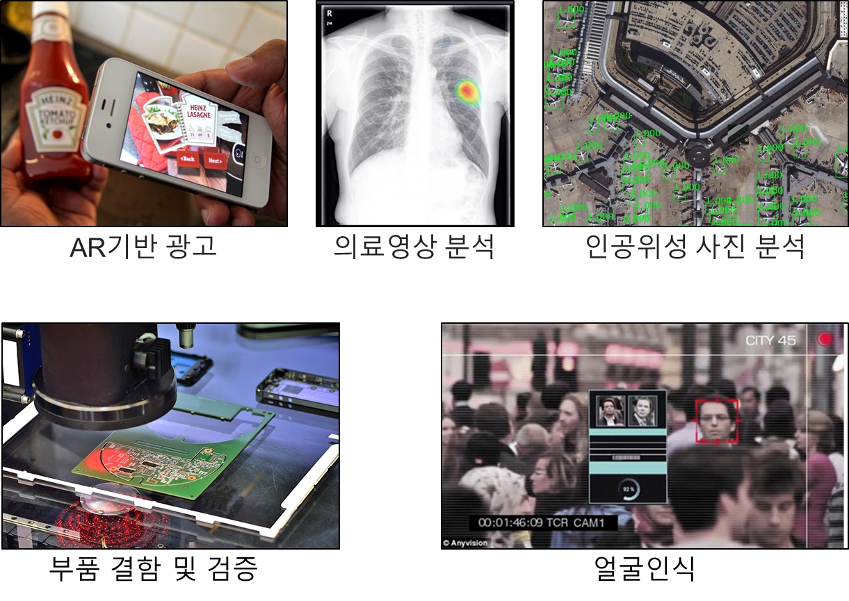 산업 분야 : 공장의 제조 라인에서 부품의 결함과 불량을 찾아내는 데 활용됩니다. 물리보안이 필요한 곳에서는 CCTV와 연계해 사람을 탐지하고 더 나아가 얼굴인식을 통해 침입여부도 파악합니다.