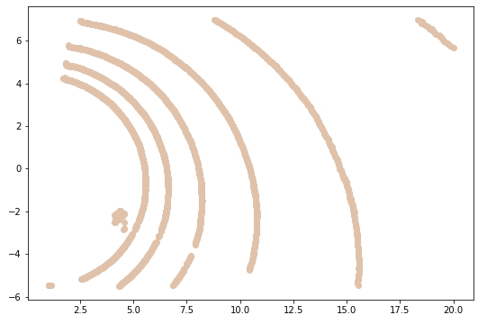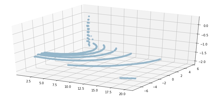 위 그림은 바닥제거를 위해 ROI Filter를 사용한 것입니다. y좌표 -2.0 부분에 타원형 선들은 센서가 바닥을 탐지 하여 표시한 것입니다. 바닥영역의 데이터들은 불필요 할뿐만 아니라 추후 군집화 알고리즘 등을 활용시 정확도 성능에 영향을 주므로 삭제 하는것이 좋습니다. 위 예시에서는 z는 -1.2~10.0으로 설정한것입니다.