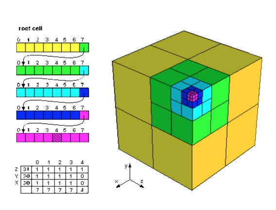 [트리는 여덟 개의 복셀과 다섯 개의 레벨을 가지고 있다. (각 레벨은 서로 다른 색으로 표현된다. )]