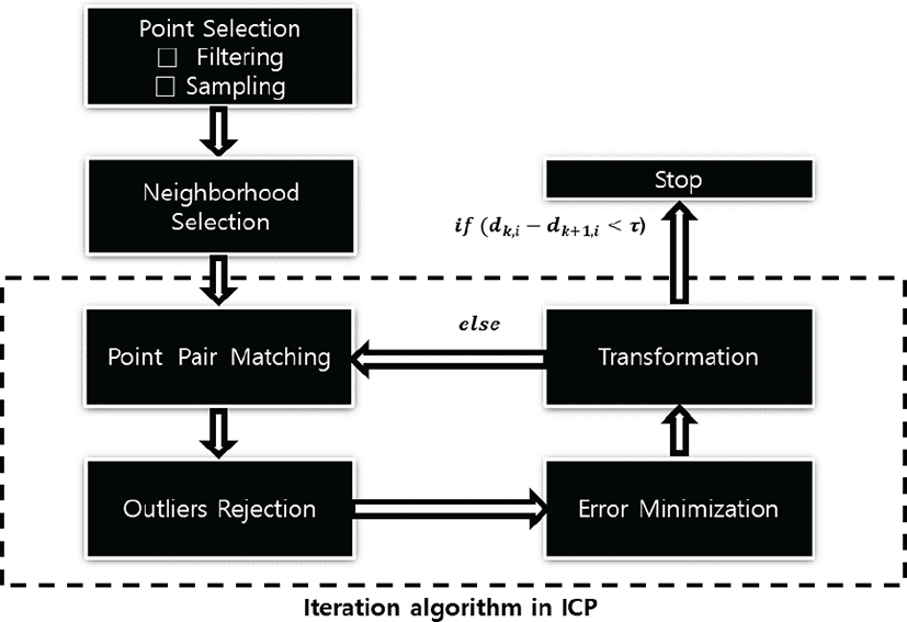 여기서 거리 오차가 일정한 한계치(tolerance, τ) 이하이면 진행을 멈주고 한계치 이상이라면 점쌍 매칭 (point pair matching) 단계로 되돌아가서 알고리즘을 다시 수행한다.
